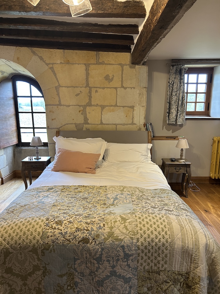 Na nog zo’n 2,5 kilometer bereiken we het manoir. We worden hartelijk ontvangen door de Engelse eigenaar, die ons door het sfeervolle landhuis naar de bovenste verdieping leidt. Onder de houten balken staat een comfortabel bed en in de koelkast vinden we bier, wijn en water – we mogen pakken wat we willen. Maar eerst: een glas bubbels in de ruime salon.