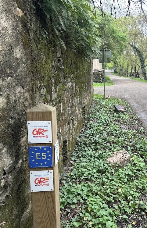 Vanaf de bushalte vinden we al snel een smal paadje langs een zijarm van de Loire, gemarkeerd met de bekende rood-witte strepen die we ook kennen van de LAW in Nederland. Het miezert en dat zal de hele dag zo blijven. Gelukkig is de route afwisselend genoeg om daar weinig aandacht aan te besteden.